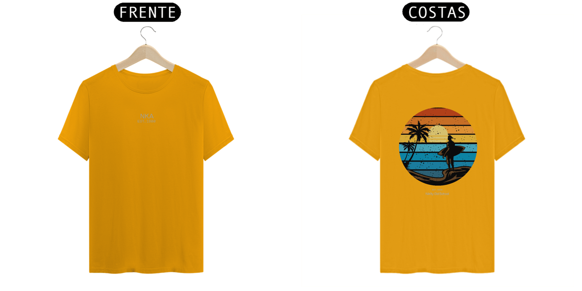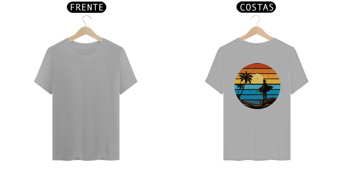 Céu laranja, mar azul, prancha debaixo do braço e um olhar fixo no infinito. A camiseta Horizonte em Chamas é um tributo visual aos fins de tarde que ficam gravados na memória — aquele momento sagrado entre o último drop e o primeiro gole no pós-surf.