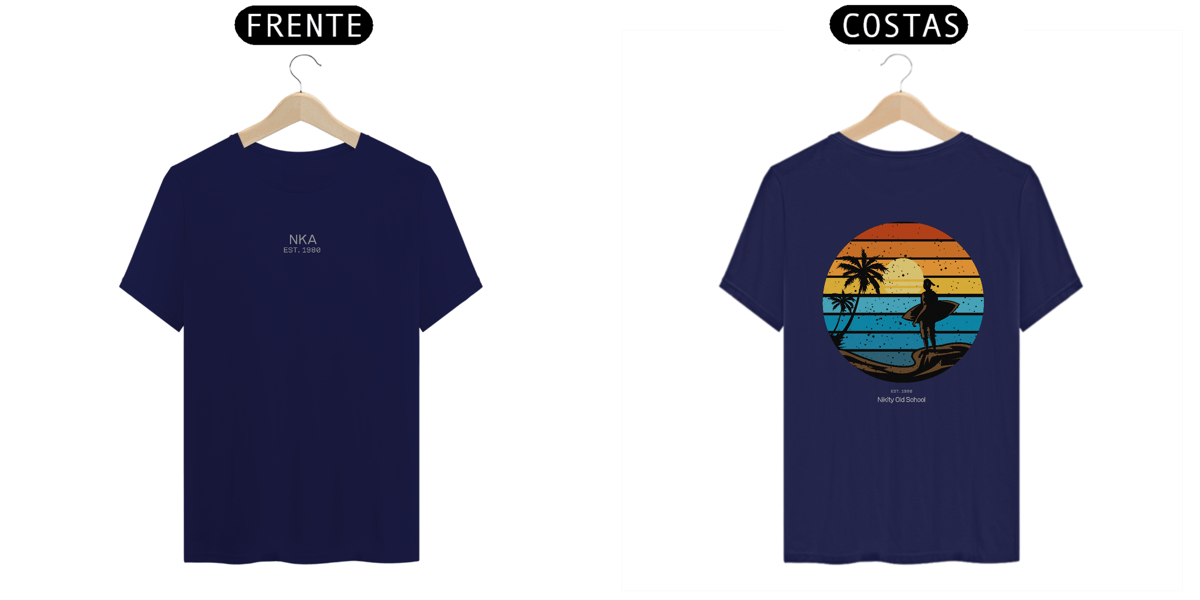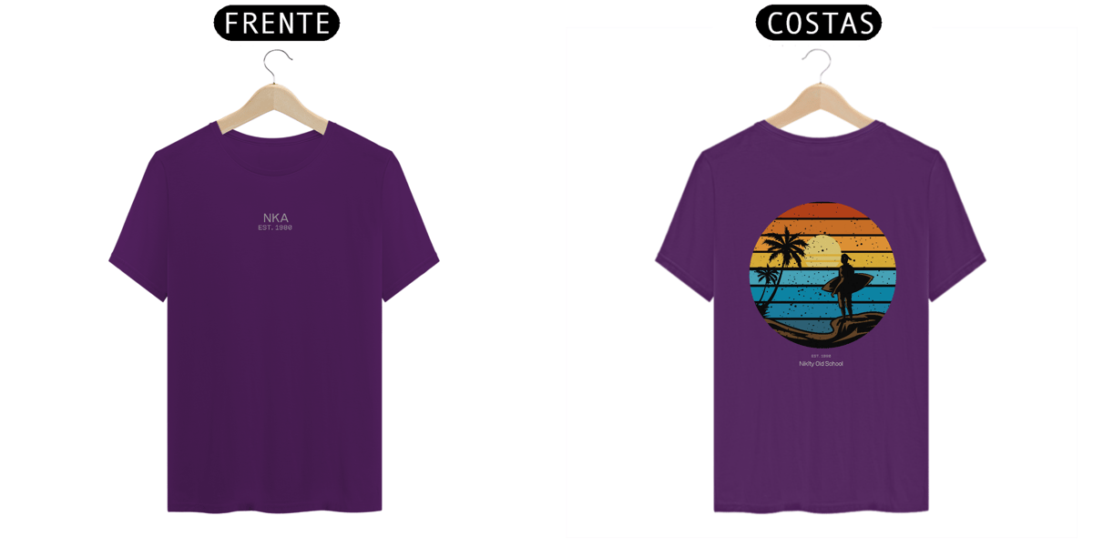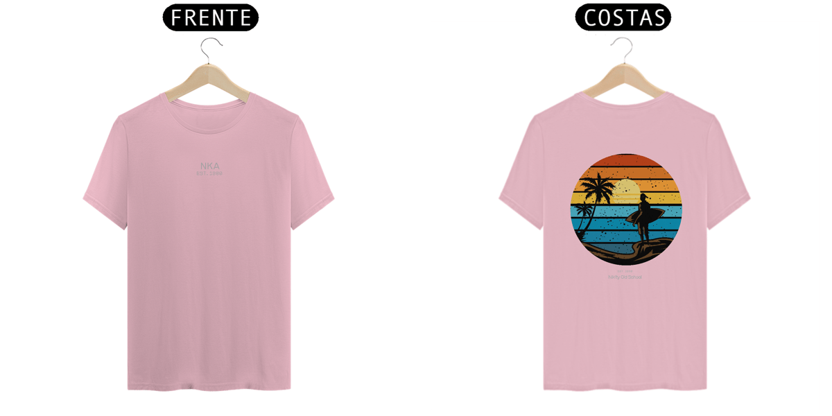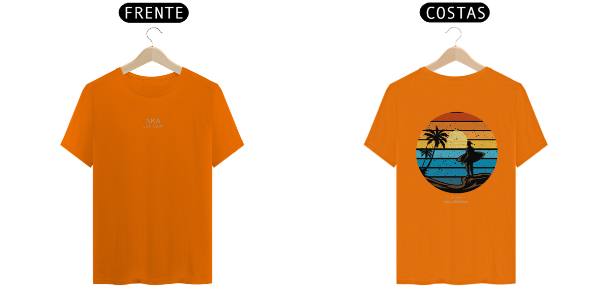 A arte circular em estilo vintage retrô, com listras que simulam o pôr do sol tropical, traz um contraste poderoso entre o fundo colorido e a silhueta escura da surfista. Uma peça da Linha NIKITY OLD SCHOOL feita pra quem vive o surf com alma, estilo e memória.