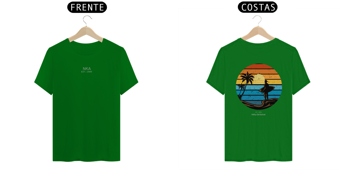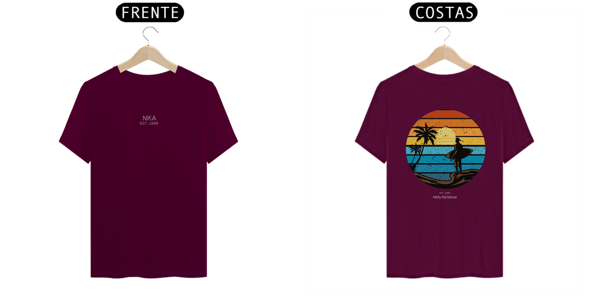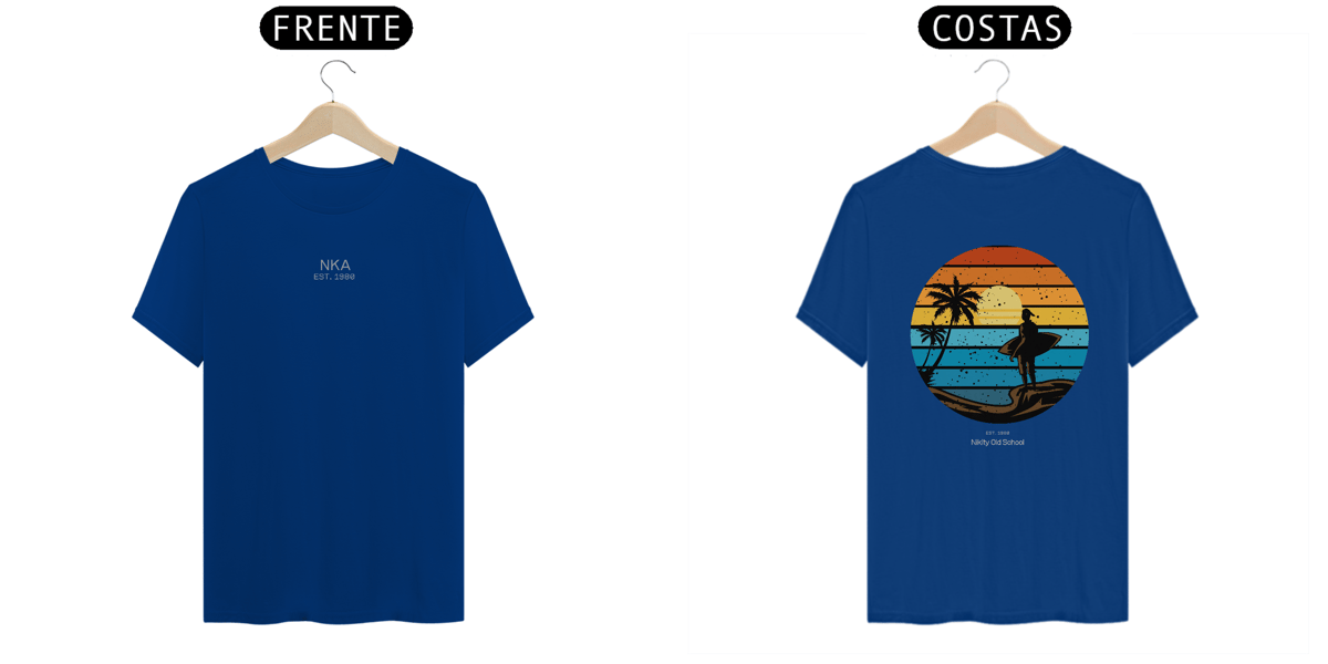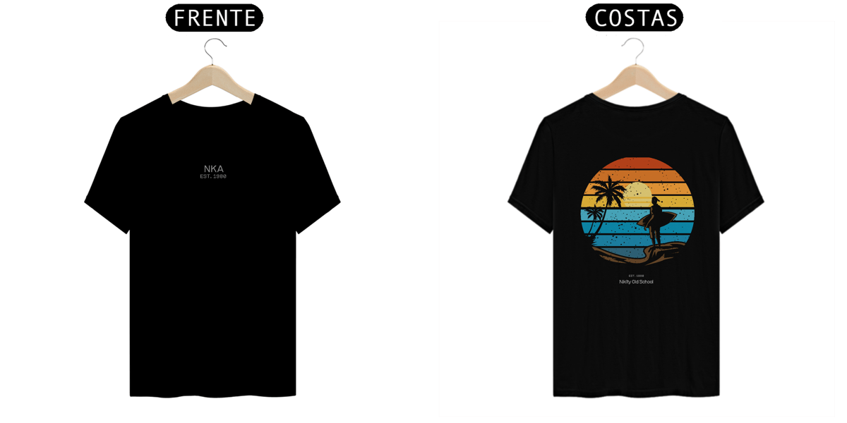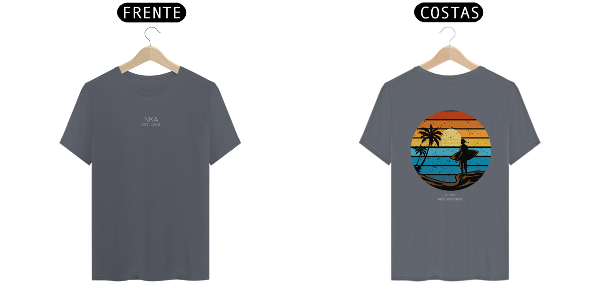 A arte circular em estilo vintage retrô, com listras que simulam o pôr do sol tropical, traz um contraste poderoso entre o fundo colorido e a silhueta escura da surfista. Uma peça da Linha NIKITY OLD SCHOOL feita pra quem vive o surf com alma, estilo e memória.